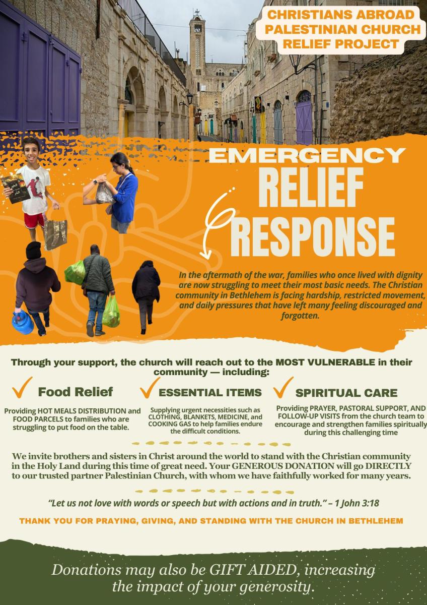We invite BROTHERS AND SISTERS IN CHRIST around the world to stand with the CHRISTIAN COMMUNITY IN THE HOLY LAND during this time of great need. Your GENEROUS DONATION will go DIRECTLY to our trusted partner PALESTINIAN CHURCH, with whom we have faithfully worked for many years.